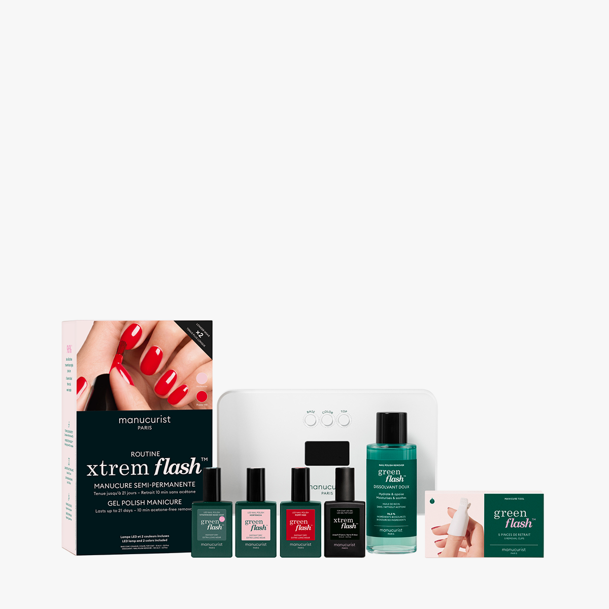 Součástí setu je PRO LED lampa 36W, která zajišťuje rychlé a rovnoměrné vytvrzení jednotlivých vrstev. Manikúru doplňuje také Green Flash Xtrem Top Coat, který vytváří ochrannou gelovou vrstvu s extrémním leskem a výdrží až 21 dní.